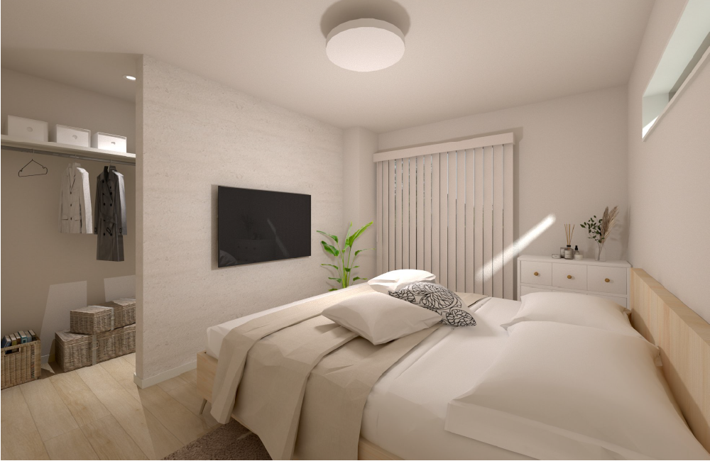 主寝室はバルコニーに面した、やさしい風がそよぐ心地よい空間です。ウォークインクローゼットには、ご夫婦の洋服はもちろん、スーツケースのような大きなものもたっぷりしまえます。収納量をしっかりと確保しているので、お部屋全体がスッキリ見え、ゆったりとしたスペースで心地よく過ごせます。
