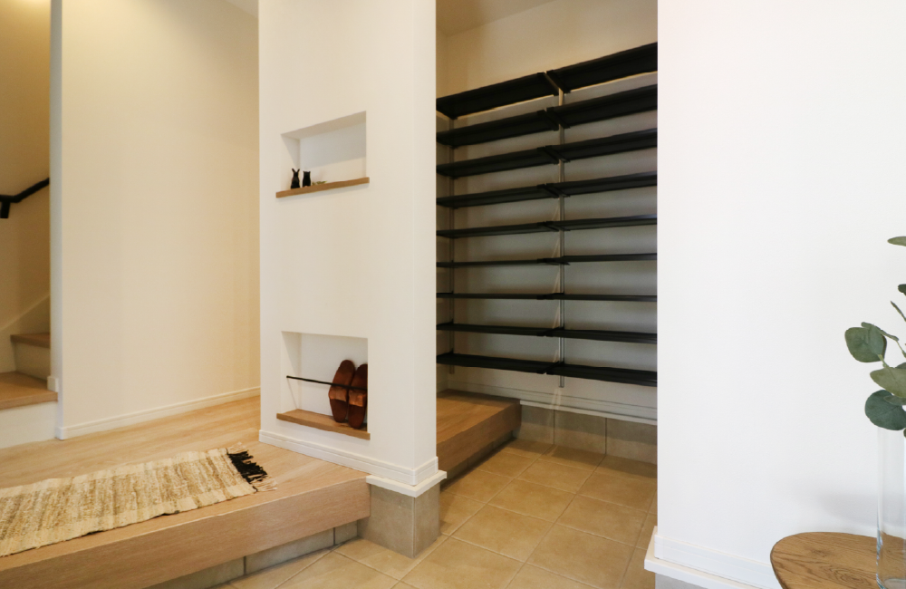 家族の出入り用と来客用で使い分けができる2WAY玄関です。家族用はシューズクローゼットを兼ねていて、たくさんの靴やガーデニング用品、アウトドアグッズなどもまとめて収納できます。急な来客の際も、シューズクローゼットの扉を閉めるだけで、見られたくないものをしっかり隠せます。