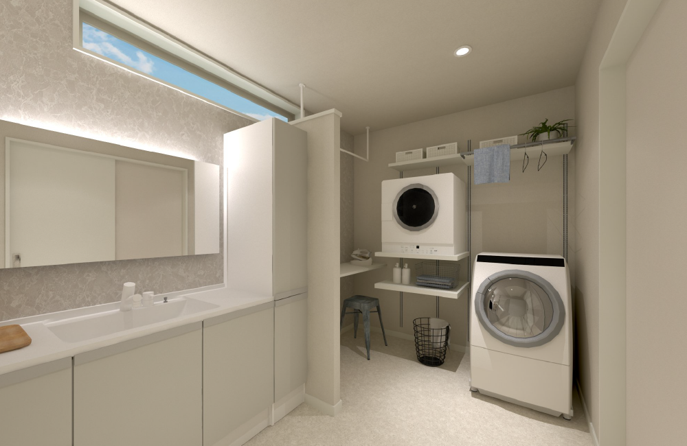 4帖超の広さがある洗面室は、脱衣室と扉で仕切られているから、誰かが入浴中でも気兼ねなく使えるのがうれしいポイントです。室内物干しを設置しているので、雨の日や夜間のお洗濯もここで完結できます。カウンターも備えていて、洗濯物をたたんだりアイロンをかけたりと便利に使用できます。