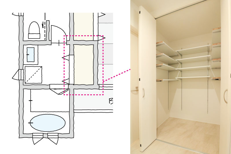 各居室のクローゼットとは別に、1階の中心にウォークインクローゼットがあります。家族みんなで使ったり、季節ものをまとめて収納できます。
