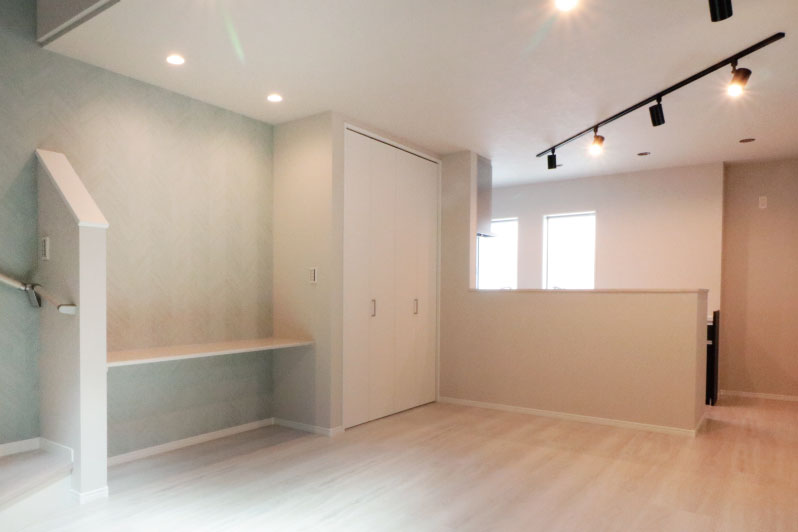 リビング横にあるスタディスペースは、2人並んでも余裕のある広さ。ソファでのんびりしながら、子供の勉強している様子を見ることができます。スペース横の収納に、ランドセルや学校のプリントもスッキリしまっちゃいましょう。