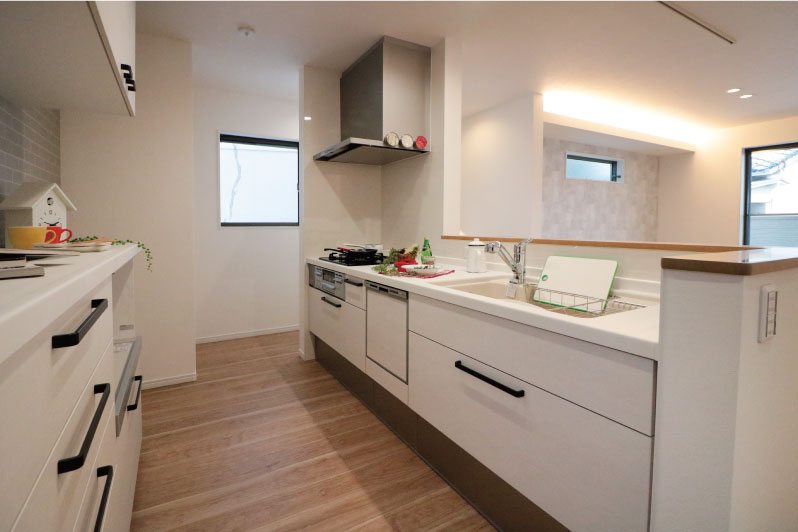 ぐるっと回れて、家事がテキパキ進むキッチンスペース。クローズドキッチンなので、調味料など散らかっていてもOK。パントリー2か所とカップボードがあるので、見せたくないものは隠しちゃいましょう。