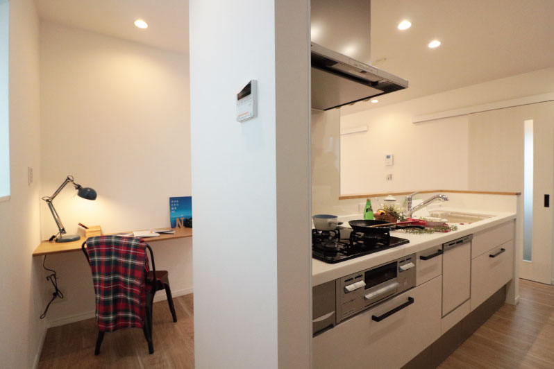 キッチンから見えるスタディカウンター。子供の「ちょっと教えて~」もぐるっと回らず、直ぐに駆けつけることができます。キッチンにすぐ戻れるからこそ、料理の合間に一息ついたり、パソコンで調べ物したりとママにもうれしいスペースです。