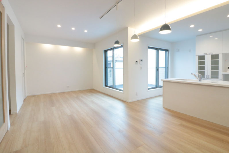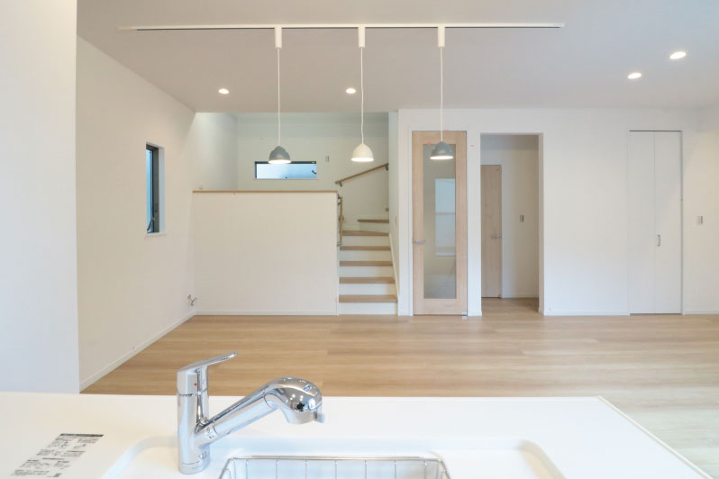 キッチンとリビングの二面に接するバルコニーを設けることで、明るさと開放感のある空間になりました。