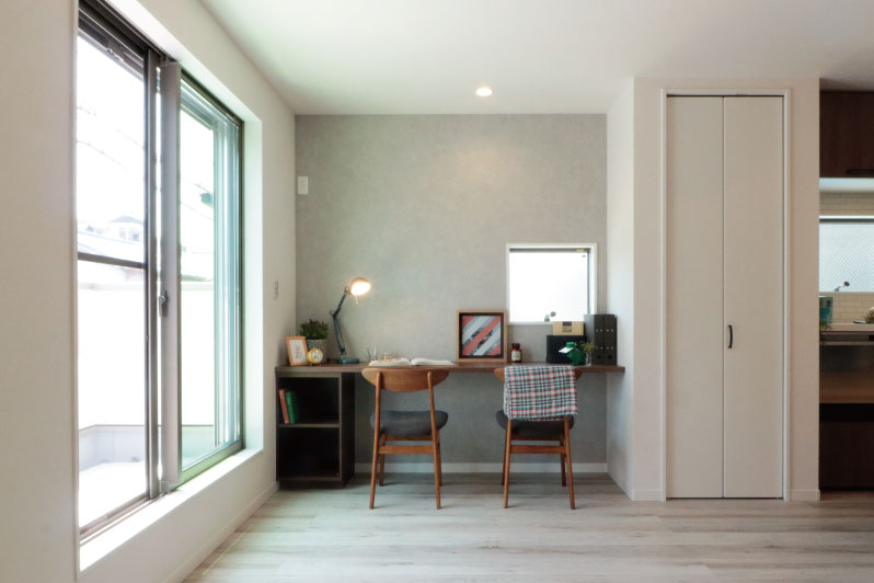リビングの一角に設けた、スタディスペース。料理の合間にホッとひと息付けるママの家事スペースとしても。デスクの下には、本やおもちゃなどがしまえる収納棚付きで机の上はいつもスッキリ。