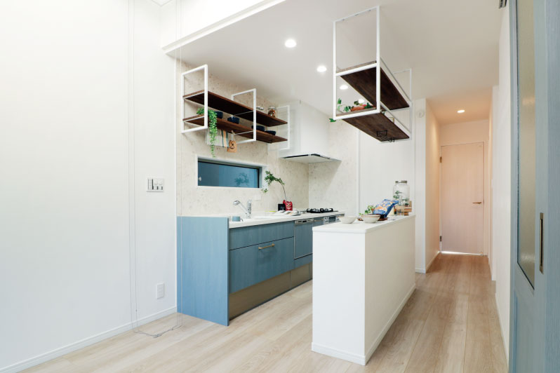 壁付けキッチンに造作のアイランドカウンターを設けました。吊戸棚にはよく使う調理器具やお気に入りのインテリアを飾って楽しむこともできます。カウンターを囲んで家族や友人と調理しながら食事をしたり、調理スペースを広く使えるので凝った料理やお菓子作りをする時もスペースに困りません。
