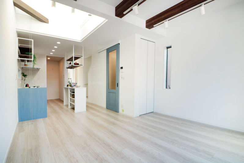 料理好きのあなたに贈る、カウンターキッチンがあるお家ができました。I型キッチンを壁付けにして、中心に吊戸棚のあるオリジナルのアイランドカウンターを設けています。カウンターを置くことで、ご家族やご友人を招いてワイワイしながら料理を楽しむことができます。左右に壁がなく、回遊しやすいのもポイントです。さらに、キッチン横には冷蔵庫や家電製品もスッキリおさまる大きなパントリーがあり、見せたいものはカウンター上部の吊戸棚へ、見せたくないものはパントリーにしまうことができます。淡いブルーとウォルナット色をアクセントとしたやさしい色味の空間に、吹抜けやリビング階段など自然とコミュニケーションを育むことができるお家です。