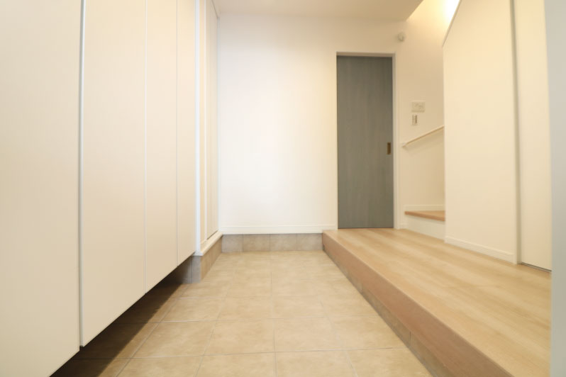 広い空間が心地よい玄関スペース。幅が約2mほどあるので、家族が並んで靴が履けちゃう広さです。ベビーカーやお気に入りの自転車をそのまま家の中に置くこともできます。靴を履いたままご近所の方とお話したり、散歩終わりのワンちゃんの足を拭いたりと広いからこそ色んな使い方ができる空間です。
