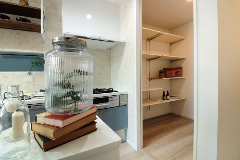 どうしても生活感が出てしまうキッチン回り。そんな悩みを解決するのがキッチン横の大型パントリー。冷蔵庫や電子レンジなどの大型家電までスッキリ収まります。壁一面には可動棚があるので、収納したいものにあわせて高さを変えることができるので、買い置きや日用品までたっぷり収納できます。