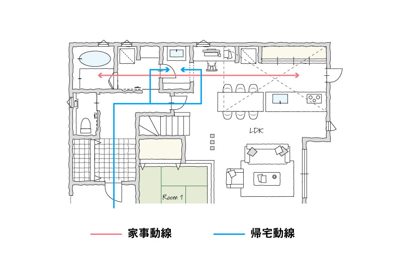 浴室ー脱衣室ー洗面室ーダイニングーキッチンが一直線に繋がっているため、お料理、お洗濯をしながら無駄なくスムーズに家事を行うことができます。また、リビング、玄関の両方から洗面室に入れる事で帰宅した子供に手洗いうがいを促すことも。さらに、洗面台が独立しており、朝の忙しい時間でも家事や身支度で洗面所が混雑する事なく使えます。背面には収納も取っているのでかさばりがちな日用品や衛生品をたくさんストックすることが出来ます。