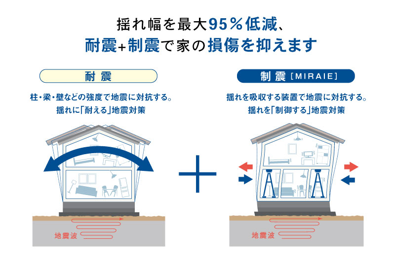 大規模な地震への備えとして、最高等級となる耐震等級3を採用しました。でも、ご家族が暮らす大切な住まいを守る地震対策は、耐震だけで十分でしょうか。そこで私たちが提案したいのが「耐震+制震」。住まいの持つ耐震性を損なうことなく、新たな性能を加え、本震だけでなく、繰り返し来る余震にも強い、より安心・安全な住まいに。