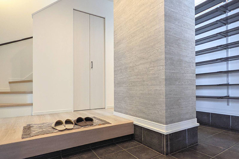 ベビーカーも楽に置ける広い玄関スペースは、誰がいつ来てもスッキリ片付いているお客様用と、お行儀悪く靴を脱いでいても大丈夫な家族用の2WAY仕様。靴の収納はもちろん、コートやカバンを掛けるバーも付けているので、毎日の習慣で整理整頓もバッチリです。