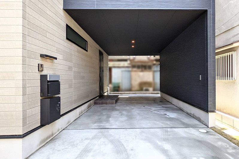 箱を重ね合わせたようなインパクトある外観に、大きな車も屋根の中にすっぽり入るインナーガレージのあるお家です。ガレージと言っても、家族で楽しんでもらえるよう、ゆとりある広さを確保しました。愛車やバイクを止める以外に、日焼けを気にせず親子で楽しめるプールや愛犬の遊び場、子供の秘密基地など使い方は様々。家の「外」でありながら、「室内」空間があることで、一味違う愉しみ方が広がります。このお家の良さはガレージだけではありません。家族用と来客用を分けて使えるシューズクロークのある2WAYの玄関に、各所にある適材収納など生活感が出ないような工夫に加え、回遊できるキッチンを中心に、日々の家事をスムーズにする動線も取り入れました。