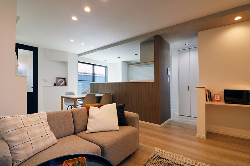 北向きで、前道は行き止まりのロケーション。車の出し入れをしやすく、北向きながらでもしっかり採光を確保し、どの部屋も明るいお家にしようと設計しました。ガレージハウスをイメージするようなかっこいい外観は、ネイビー色をベースに落ち着いた木目をアクセントに使用し、スタイリッシュで落ち着きのあるデザインに。回遊できるキッチンは、リビングとダイニングの繋がりを大切にしながら、家事動線、バルコニーへのアクセスなどの生活動線も配慮しました。キッチン上の折下げ天井や、リビングの造作照明、デッドスペースを活かした斜めの収納も見どころです。