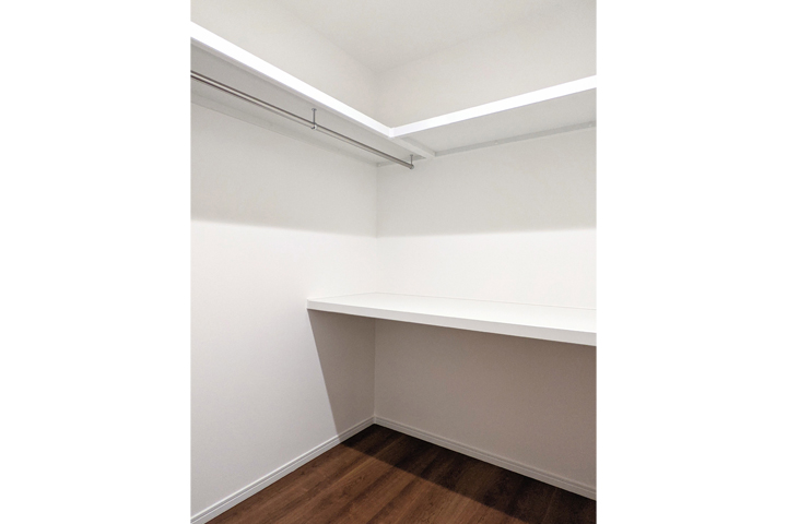 1階の廊下から出入りできる、大きなウォークインクローゼット。季節外の衣類や布団、防災用品を保管しておける納戸のような役割の他に、ハンバーパイプ付きなので、家族分のお出かけ時のコートや上着をかけておくスペースとしても◎