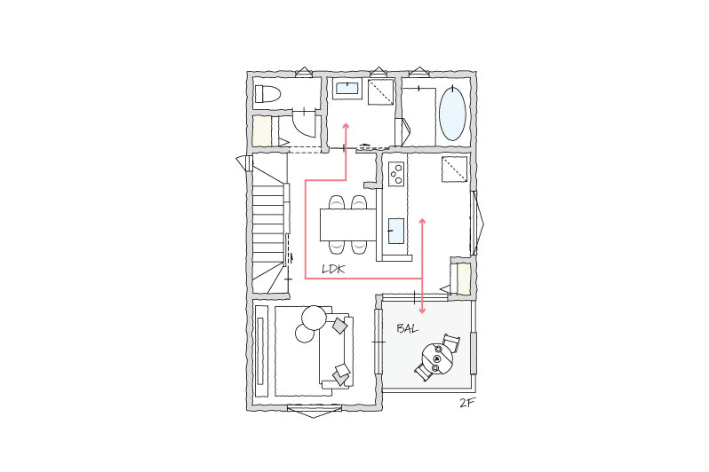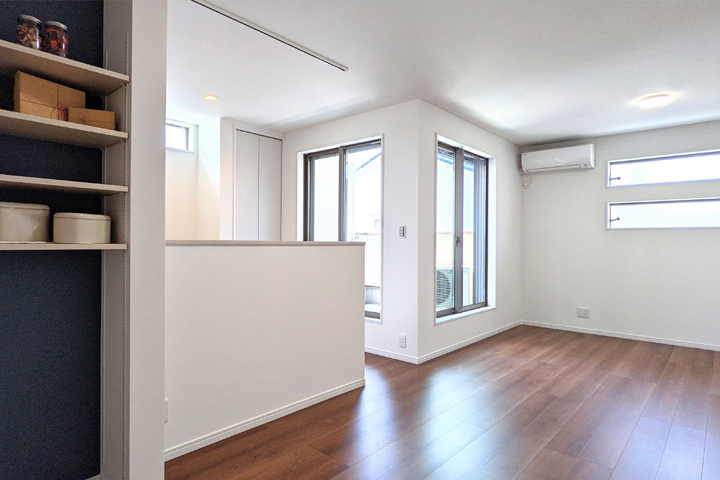 部屋を広く有効に使えるよう、家具を置いても人の動きを妨げないよう考えた無駄のない間取りになっています。ゆったりとくつろぐリビングをしっかりとゾーニングしました。2階にキッチン・洗面・お風呂と水回りをまとめ、3階には廊下から出入りできるバルコニーでスムーズに家事をこなす動線も取り入れました。
