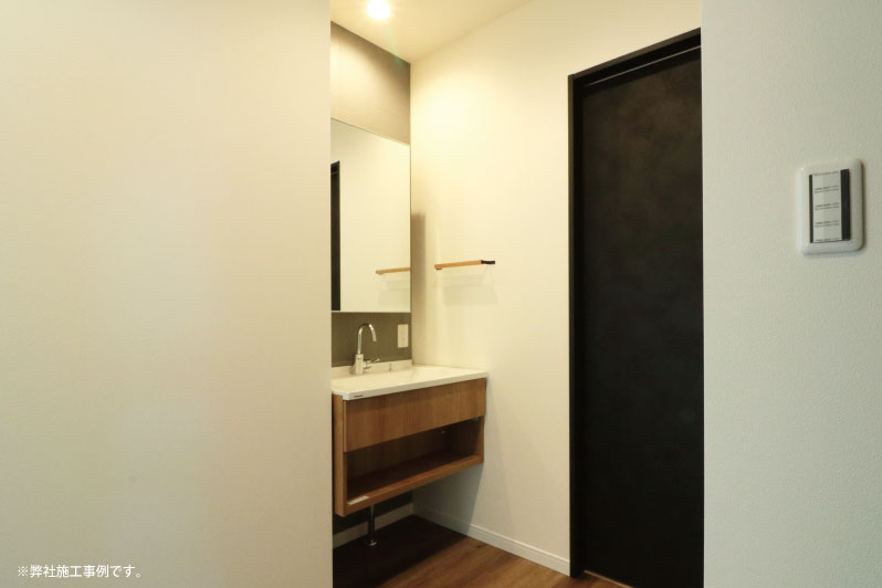 脱衣所も洗面台も、同時に別の人が使える独立洗面台。来客時には洗濯物などの生活感が出にくくスッキリ見えるので、お客様に遠慮なく洗面台を使ってもらうことができます。帰宅すればすぐに目に付く位置にあるので、自然と手洗いうがいをしてから2階に上がる習慣がつきそうです。 ※写真は弊社施工例です。