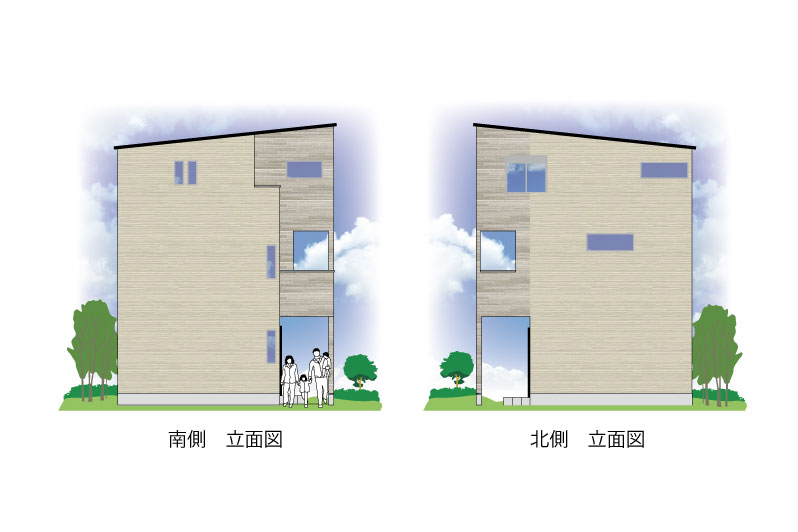 南向きながらも専用通路の旗竿地をどう活かそうか悩みました。北側の空きを利用し、風の抜け道とライフスタイルに変化がでればと、トンネルを作ることにしました。ポーチ部分と2階のバルコニーをトンネル状にし、風の通りも考慮しながら、プライバシーを確保しました。特にLDKにはこだわり、料理を楽にする横並びダイニング、キッチン前には子どもの宿題やテレワークに使えるカウンターを設けました。リビングダイニングと繋がるバルコニーは大きな窓で出入りでき、通風・採光を確保するだけでなく、家事をしながらでも、子どもの様子を伺うことができます。