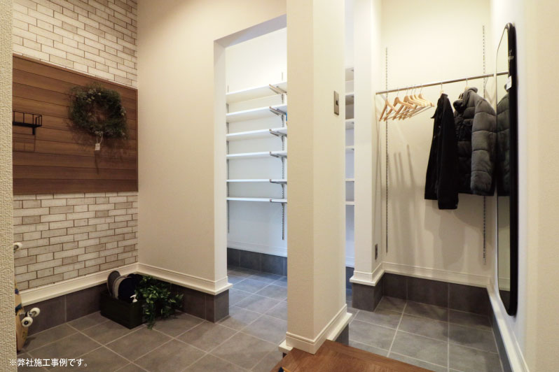 ベビーカーも楽に置ける広~い玄関スペースは、誰がいつ来てもスッキリ片付いているお客様用と、お行儀悪く靴を脱いでいても大丈夫な家族用の2WAY仕様♪靴の収納はもちろん、コートやカバンを掛けるバーも付けているので、毎日の習慣で整理整頓もバッチリです。 ※写真は弊社施工例です。