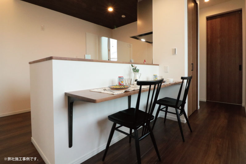 キッチンの対面には、木の温もりが感じられる集成材を使ったカウンターを設けました。調理中や片付け時も、カウンターで勉強している子供に目が行き届きやすく、子どもの「これ教えて~」にも素早く答えられそうです。子どものスタディスペースだけではなく、テレワークスペースとしても。 ※写真は弊社施工例です。