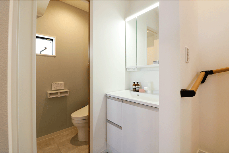 脱衣所も洗面台も同時に別の人が使える独立洗面台。来客時には洗濯物などの生活感が出にくくスッキリ見えるので、お客様に遠慮なく洗面台を使ってもらうことができます。キッチンのすぐそばにあるので、朝ごはんの準備や洗濯をしながらでもササッと身支度ができちゃいます。