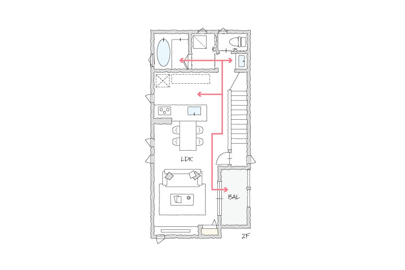 料理や洗濯、掃除といった毎日の家事の負担を軽くするためにキッチンを中心に水回りをコンパクトにまとめました。キッチンの後ろには洗面台と脱衣室があり、料理の準備をしながら洗濯やお風呂掃除をしたりと同時に家事をこなすことができます。また、同じ階にバルコニーがあるので、重い洗濯物を持って階段を上がる必要もありません♪