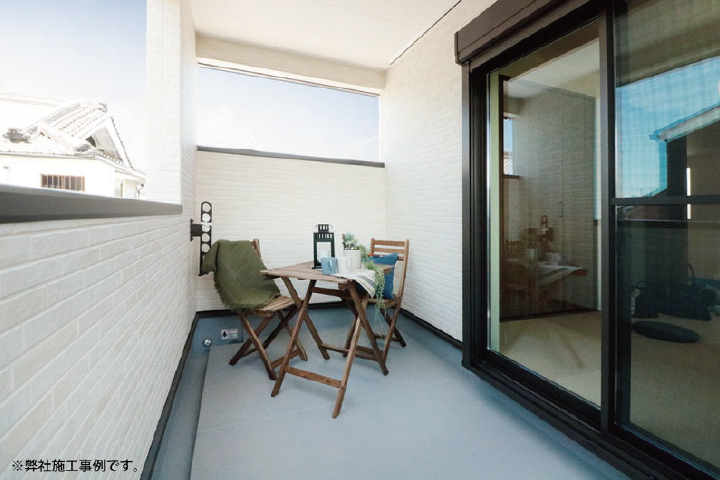窓を大きくとった、リビングに面した約4帖の大きなバルコニー。南東側からの明るい陽射しと、空間の広がりをリビングにもたらします。リビングの延長として使えるので、バーベキューやホームパーティーなど、お手軽にアウトドア気分も楽しめ、家族や友人とリフレッシュできます。※当社施工写真です。