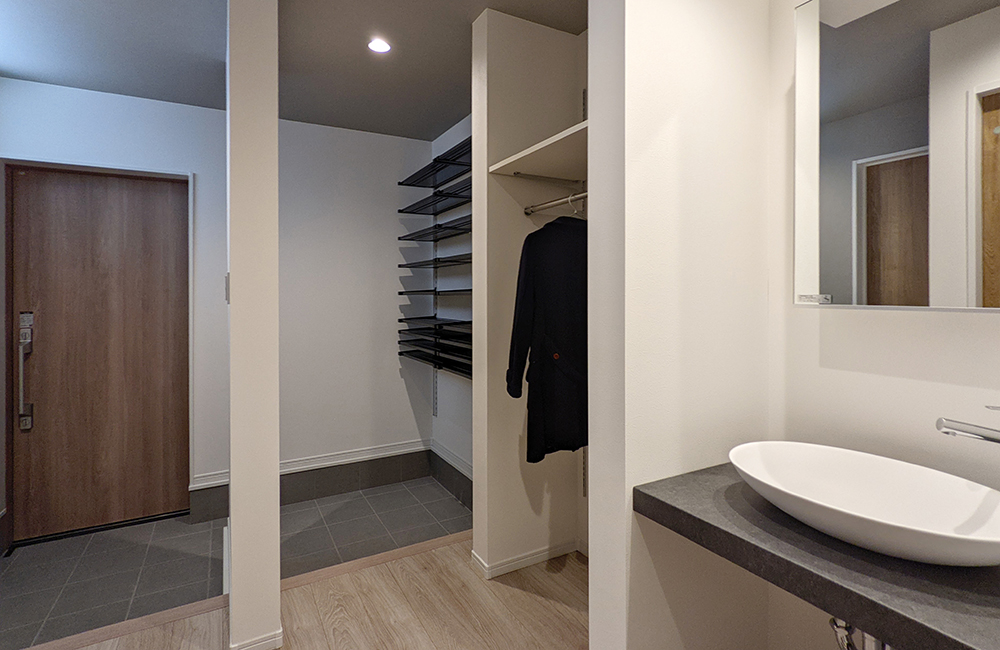 玄関ホールには、自然と手洗い習慣が付きそうな、オシャレに造作した独立洗面台を設けました。ベビーカーをたたまずに置ける広い玄関ホールは、家族用と来客用を分けられる2WAY仕様。家族用の玄関側には、靴の収納やコートやカバンを掛けるハンガーパイプも付いているので、毎日の整理整頓もバッチリです。