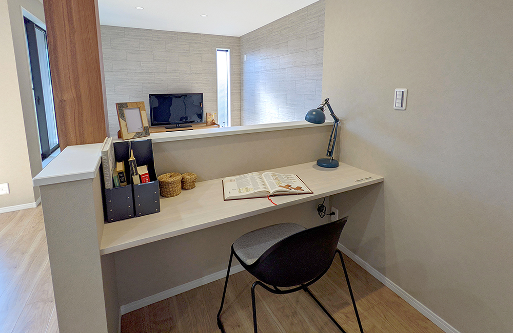 LDKには、リビングやキッチンから目が届く場所に、スタディカウンターを設けました。対面式だから、子どもが宿題で、わからない所があった時には声をかけやすく、教える時には、サッと勉強を見に行ってあげたりと、お互いにコミュニケーションが、取りやすくなっています。また背景が壁になっているので、コロナ渦でのテレワークのビデオ会議でも、家の中を見せずに、安心して使えます。