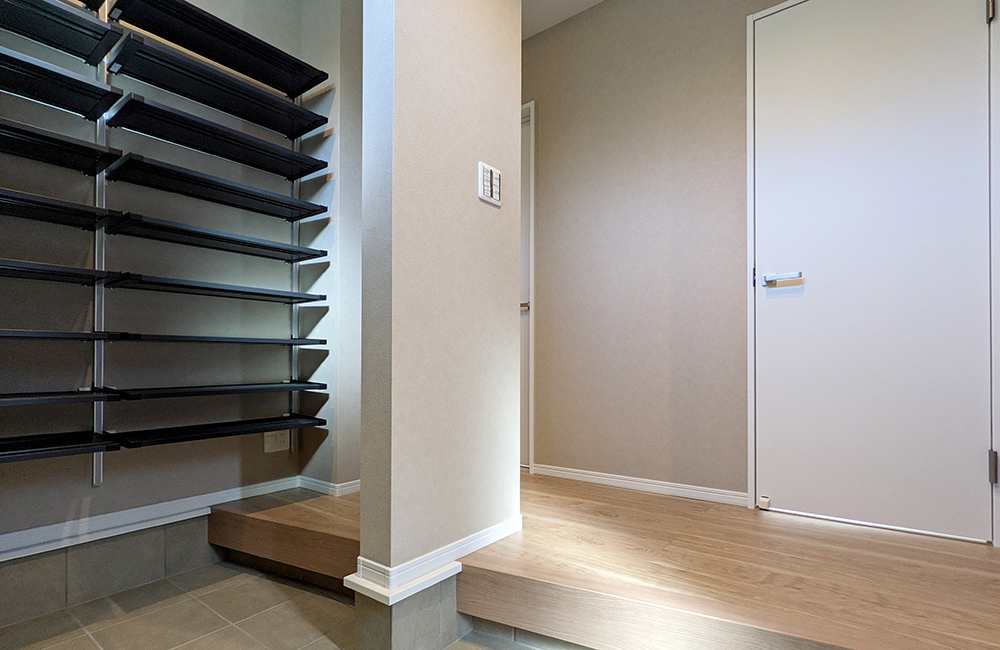 お客様用とご家族用で、玄関を2つに分けました。お客様用は、スリットガラスの入った玄関扉と、上部に横長窓を設け、外の光を取り込む明るい玄関に。ご家族用はシューズクローゼットを設け、収納力と実用性のある玄関に。2つの玄関の間を垂れ壁で、扉を設けずゆるやかに隔てることで、ベビーカーなどの出し入れも、わざわざ折り畳まず、スムーズにできるようになっています。