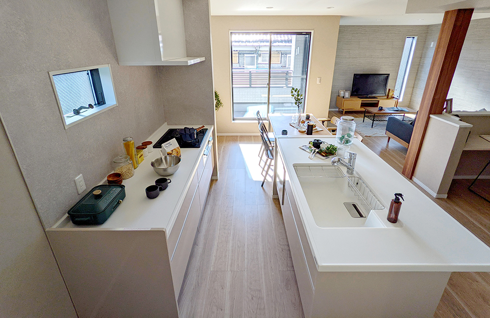 使い勝手の良さで、人気のアイランド型のセパレートキッチンを中心に、回遊出来る家ができました。ご家族が集い生活のメインとなるLDKに、キッチンやお風呂・バルコニーなどの水廻りをまとめて、「ながら作業」ができる間取りになっています。料理や洗濯といった、毎日の家事にかかる時間を減らすことで、心と時間にゆとりができ、ご家族と過ごす時間や、趣味などの自分の時間が増えますね♪また食料品や日用品をストックできる大容量の収納スペースや、テレワークで生活感を気にせず使えるスタディカウンター、手洗い・うがいのしやすい洗面台など、コロナ渦のステイホームにも対応しています。