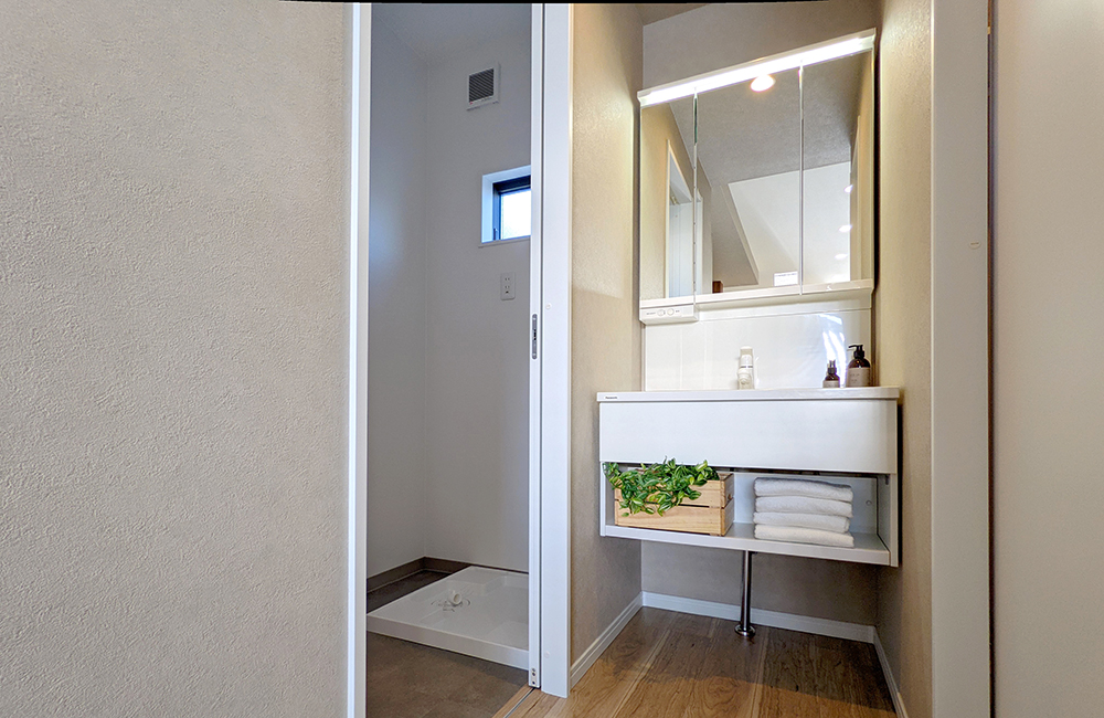 脱衣室と洗面台を分けることで、別々の人が同時に使えるようになります。もし誰かが入浴中でも、出てくるのを待たずに、手洗いやハミガキ・洗顔など、洗面台を気兼ねなく利用できます。お客様が遊びに来られた時など、生活感のある洗濯物など隠せるので、洗面台を使ってもらう際に、気持ち良く使ってもらうことができます。
