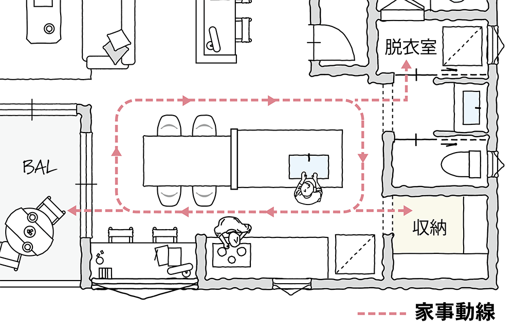 アイランド型のセパレートキッチンを中心に、洗濯機のある脱衣室やバルコニーを、回遊できる家事動線でつなぎました。水廻りとバルコニーが同じフロアにあり、階段を使わずに、料理と洗濯が効率よく行えます。またキッチン横に設けた、大容量の収納スペースは、食料品や日用品をまとめ買いでき、お買い物回数を減らせます。
