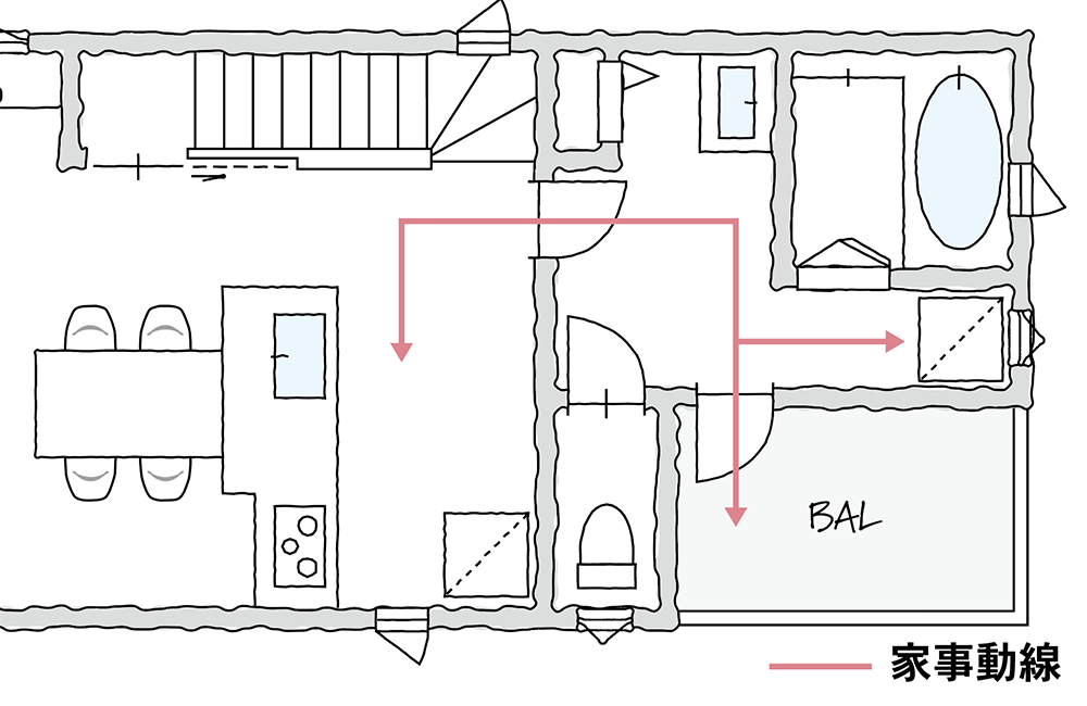 キッチンと水廻りを2階に集約して、炊事と洗濯を同時進行。洗面室からバルコニーに直接出ることができるので、洗う→干すの作業がとてもラクチンです。十分な広さをとった洗面室は、朝の身支度や、入浴に着替え、洗濯をする時も快適です。家事ラク動線で、毎日の家事の時間を短縮して、趣味の時間や家族とゆっくり過ごす時間が増えそうです♪