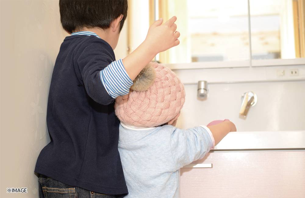 外から帰宅したらすぐに手洗いができるように、玄関ホールに手洗い器を設置しました。公園で遊んで帰って来る子供たちにも、自然と帰宅後の手洗いが習慣付きそうですね。ミラーがついているのでお出かけ前の身だしなみチェックも◎また、リビングにはスタディスコーナーを設けました。子供たちの勉強スペースとしてはもちろん、リモートワークにも大活躍です。カウンター横に可動棚があるので、ファイルや本も綺麗に収納することができます。