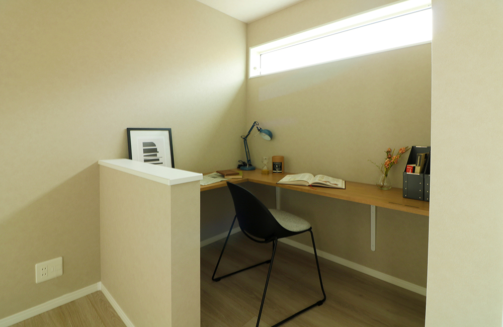 リビングには、2人同時でも使える、ゆとりを持たせたL字型のスタディスペースを設けました。扉付きの可動棚式の収納を横に設け、家族ごとに必要な物を入れておけるので見た目にもスッキリ。パソコン作業や、アイロンをかけたり、子供の学習机など、用途に合わせて家族全員がフレキシブルにお使い頂けます。