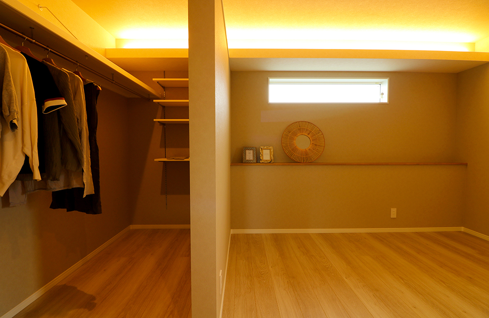 折上げ天井からの間接照明で、やわらかな光で包み込んだ落ち着きある主寝室。造り付けのベットボードに、お気に入りのアートや植栽を飾り、ホテルのようなリラックスできるワンランク上の寝室になりました。