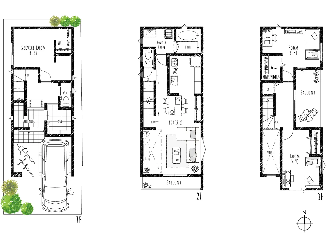 | 敷地面積 | 1号地/65.62㎡(19.85坪) 2号地/70.00㎡(21.17坪) |