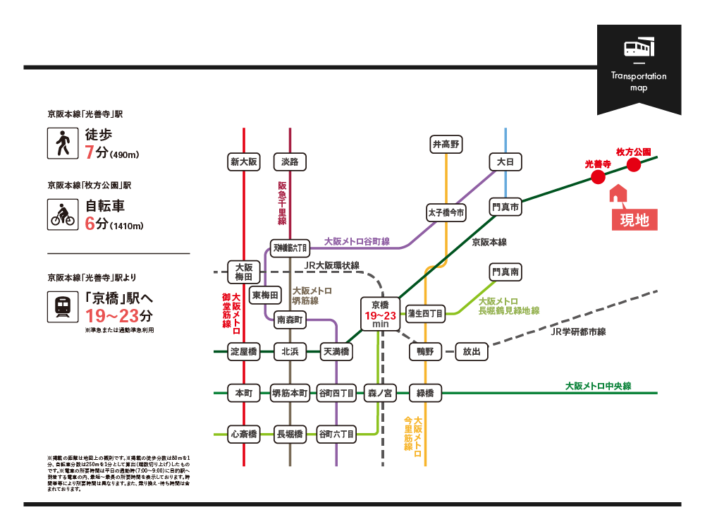 | 主要交通 | 京阪本線「光善寺」駅 徒歩7分(490m) |