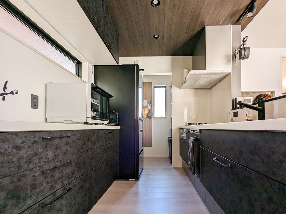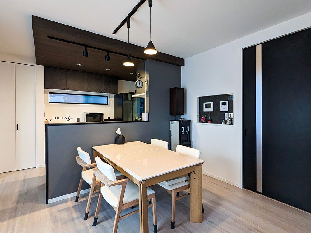 ブラックのハイドアがアクセントになった、ダイニングキッチン。