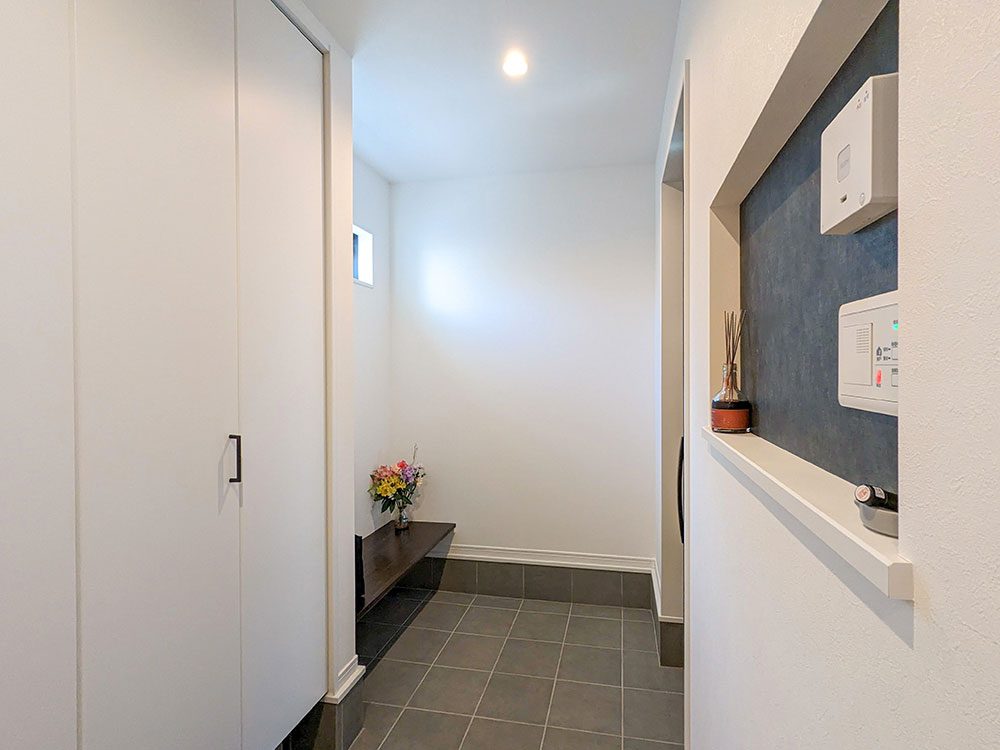 アクセントクロスをあしらった、スイッチニッチ。玄関には、モデルハウスを見て取り入れたベンチも。