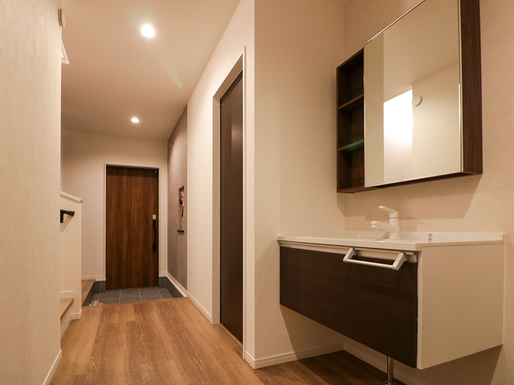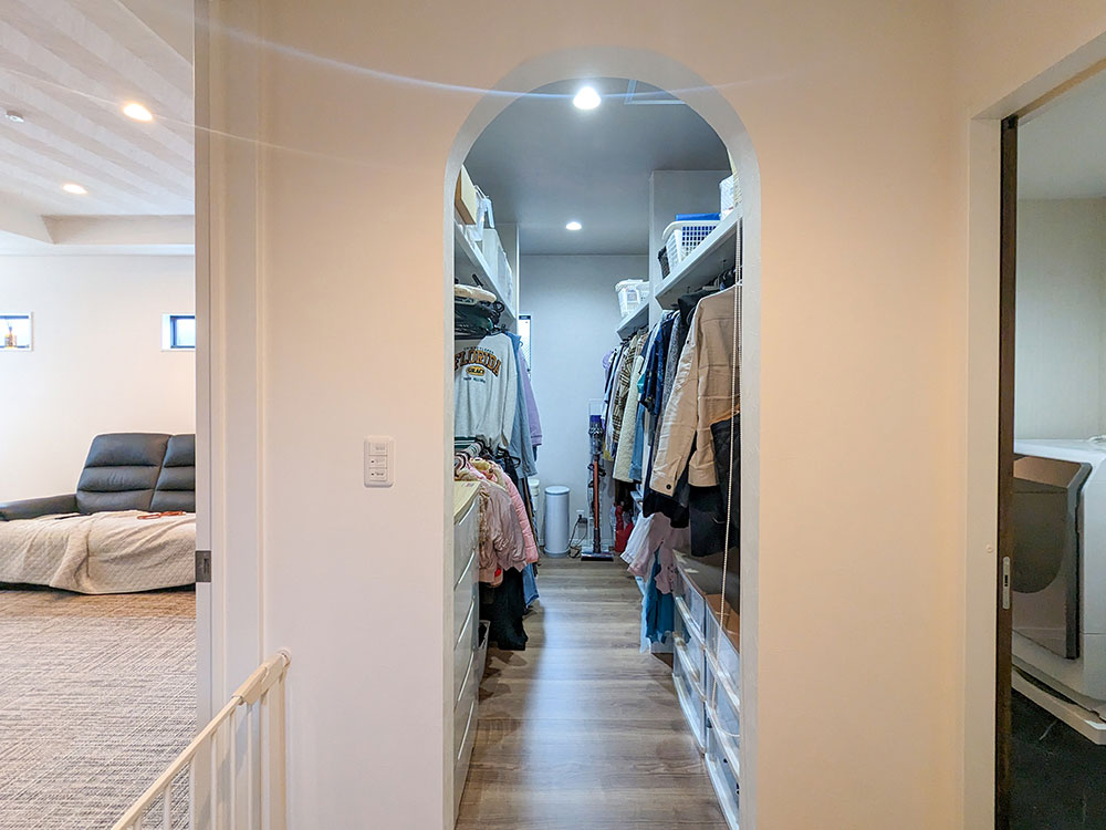 洗面室→ファミリークローゼット⇔リビングと繋がり、家事の時短に。