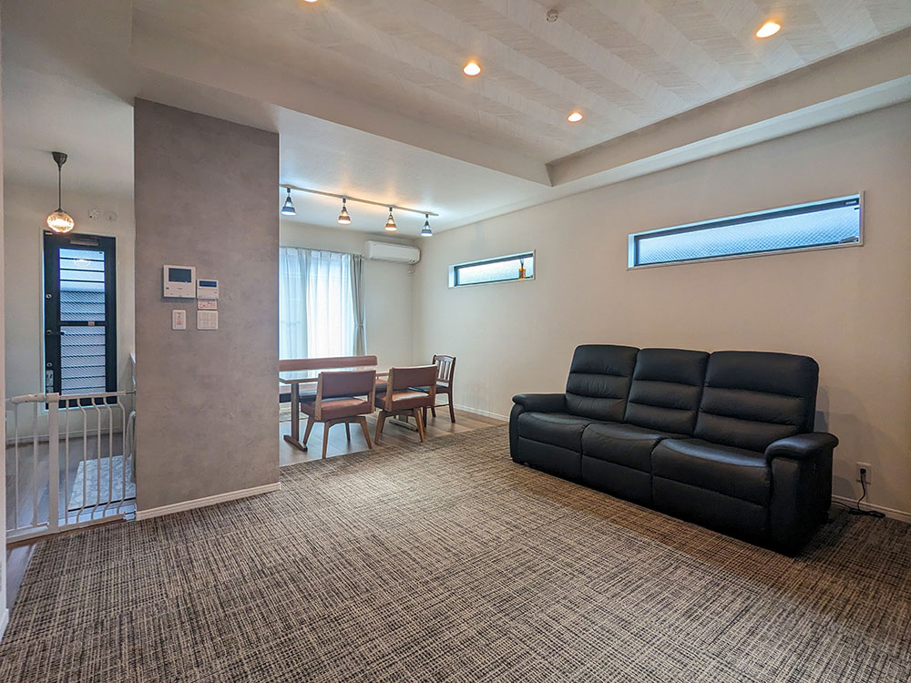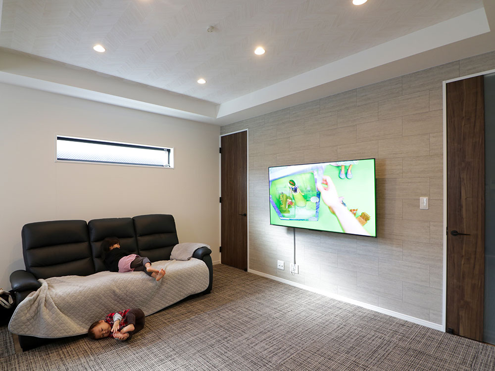 子供の遊ぶスペースも確保しつつ、リクライニングソファを置いてもゆとりがあるリビング。