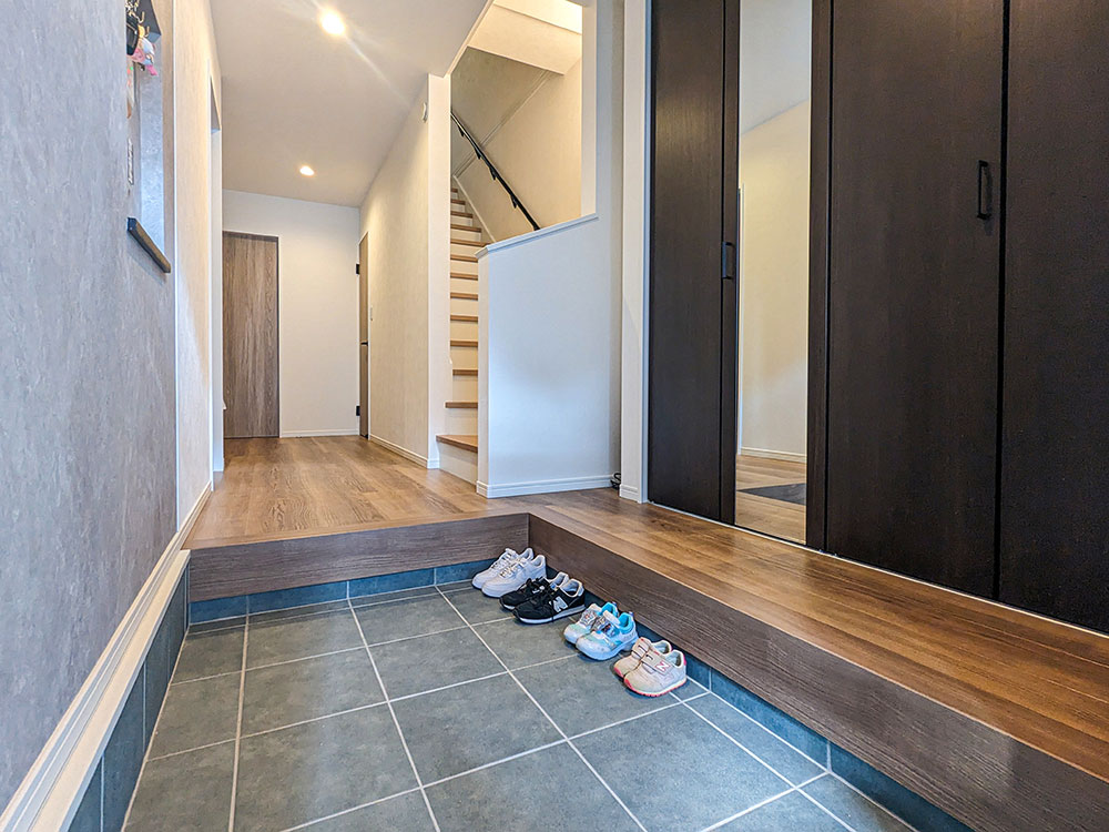 旦那様)僕は、玄関と外まわりです。玄関は、シューズクローゼットと玄関の形にこだわりました。普通の建売住宅って、玄関土間にシューズクローゼットがあるじゃないですか。わざわざサンダル履いて、もしくは靴下のまま土間に降りて靴を取り出すっていう動作が不思議で。なんでこんな造りをしているんだろう?っていつも思ってたんです。で、それをしたくなかったのであの形になりました。L字にしたことで、家族5人で並んで靴を履けるのも気に入っています。