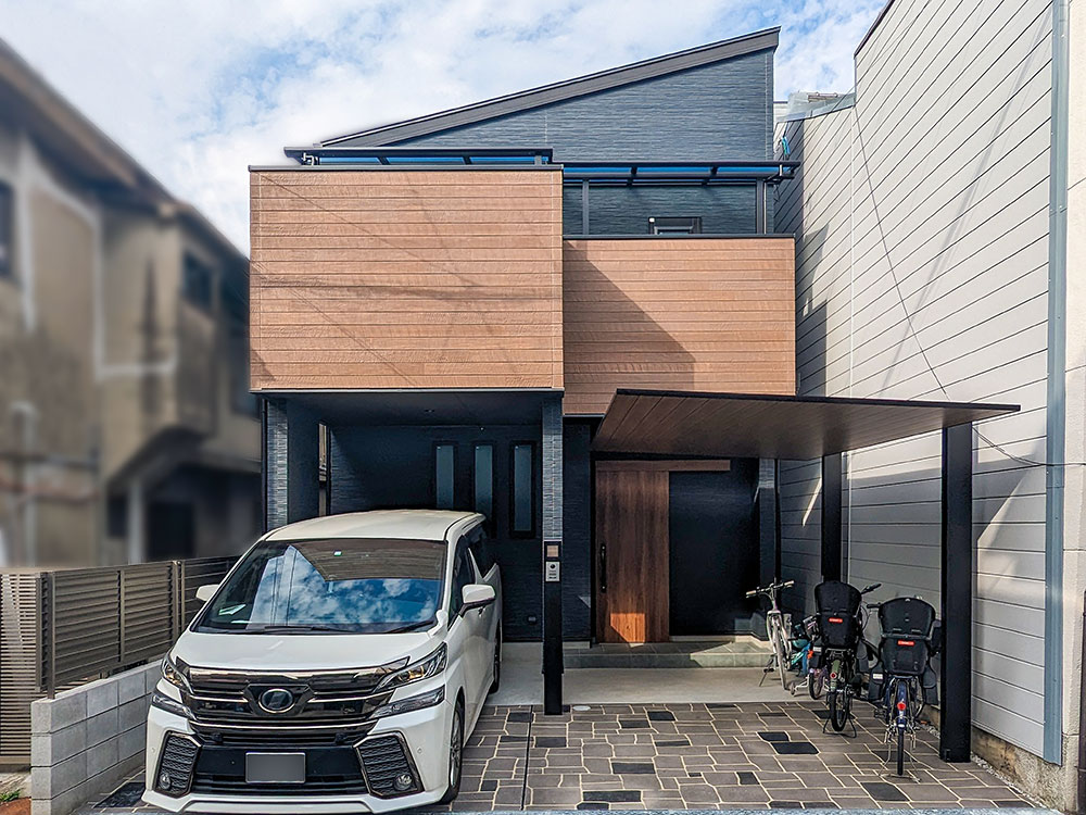 ネイビー×木目のサイディングが映える、かっこいい外観