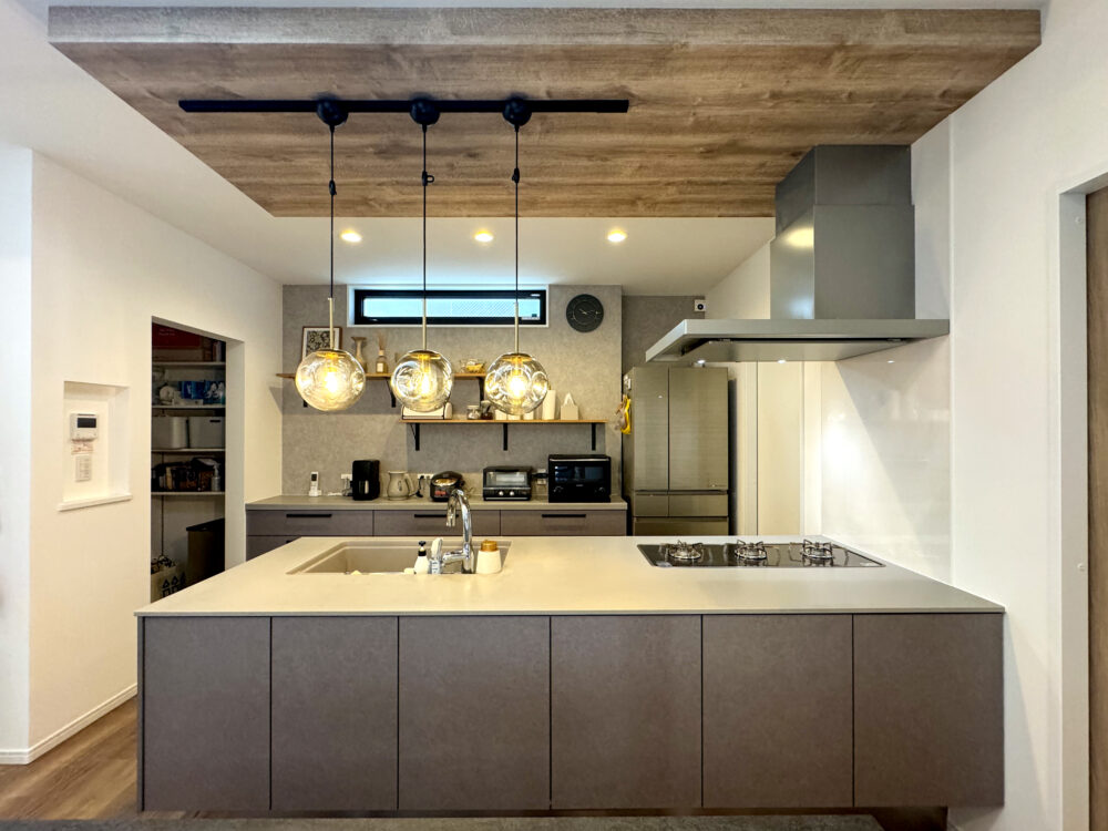 奥様)スケルトン階段とキッチンですね。どれだけ開放感を出せるか、どうすればたくさんリビングに光を取り入れるかすごくこだわりました。キッチンは、前の壁をなくしてオープンにしたかったのと、トリプルワイドコンロにしたいというのは、建てる前から決めていました。予算のこともあり、すごく悩みましたが、これにして本当に良かったです。あと、最後まで悩みましたが、洗面台もアイカの造作洗面台にして良かったと思います。