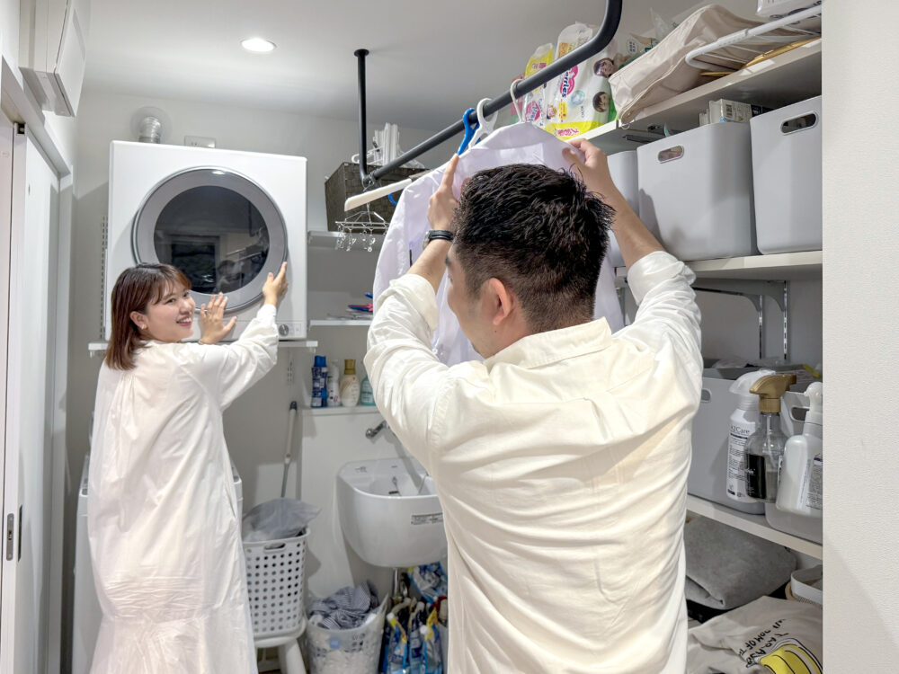 乾太くん(ガス乾燥機)と室内物干しを設置したランドリールームは、キッチンからも入れる動線に。