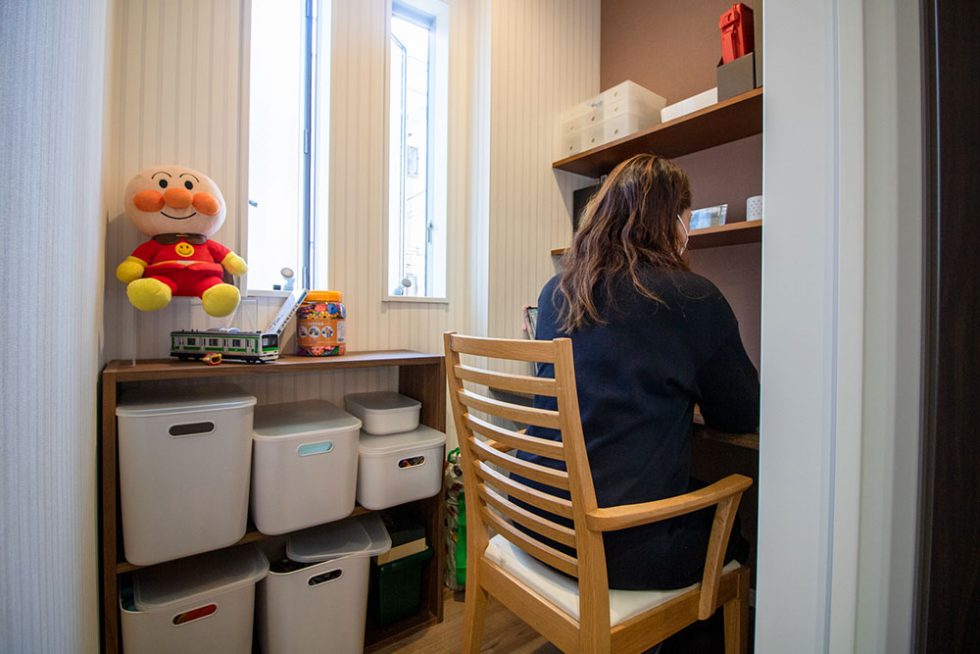 奥様)2階の家事室と収納量かな。当初家事室は、部屋干しをするランドリースペースだったのですが、棚とカウンターを付けて家事室にしました。リビング横にあるので、子供の様子を見ながら家計簿をつけたり、書類を片付けるのに使っています。おもちゃを収納する部屋としても使っていて、リビングがスッキリするし、子供が進んで片付けてくれるので、家事室にして本当に良かったです。