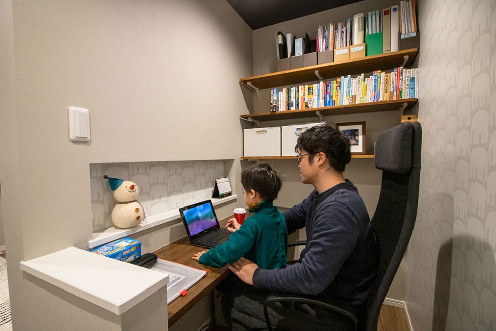 1階にある半個室になった書斎スペース。グレーを使い、落ち着いた空間に。