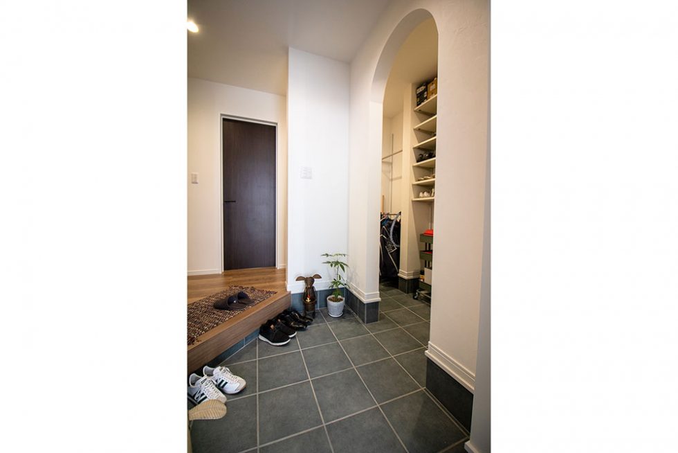 アールの垂れ壁が印象的な玄関。シューズクロークには靴だけでなくコートもかけることができる。